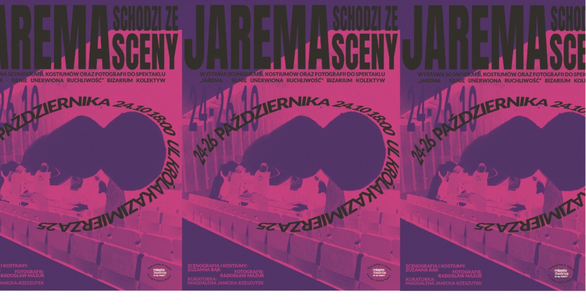 Wystawą “jarema- schodzi ze sceny” zachowuje na dłużej ulotne istnienie spektaklu “JAREMA- SILNIE UNERWIONA RUCHLIHWOŚĆ”. Instalując jego wybrane elementy w miejscu, które co do zasady jemu nie przynależy. To przecież w teatrze dzieje się magia. A co jeśli integralne części spektaklu zejdą ze sceny i zostaną ulokowane w murach starej kamienicy? Czy nadal będą oddziaływać na widza pozbawione przestrzeni teatru? Czy ich funkcja ulegnie zmianie, gdy w połączeniu z dokumentacją fotograficzną stworzą nowy, inny, artystyczny krajobraz?